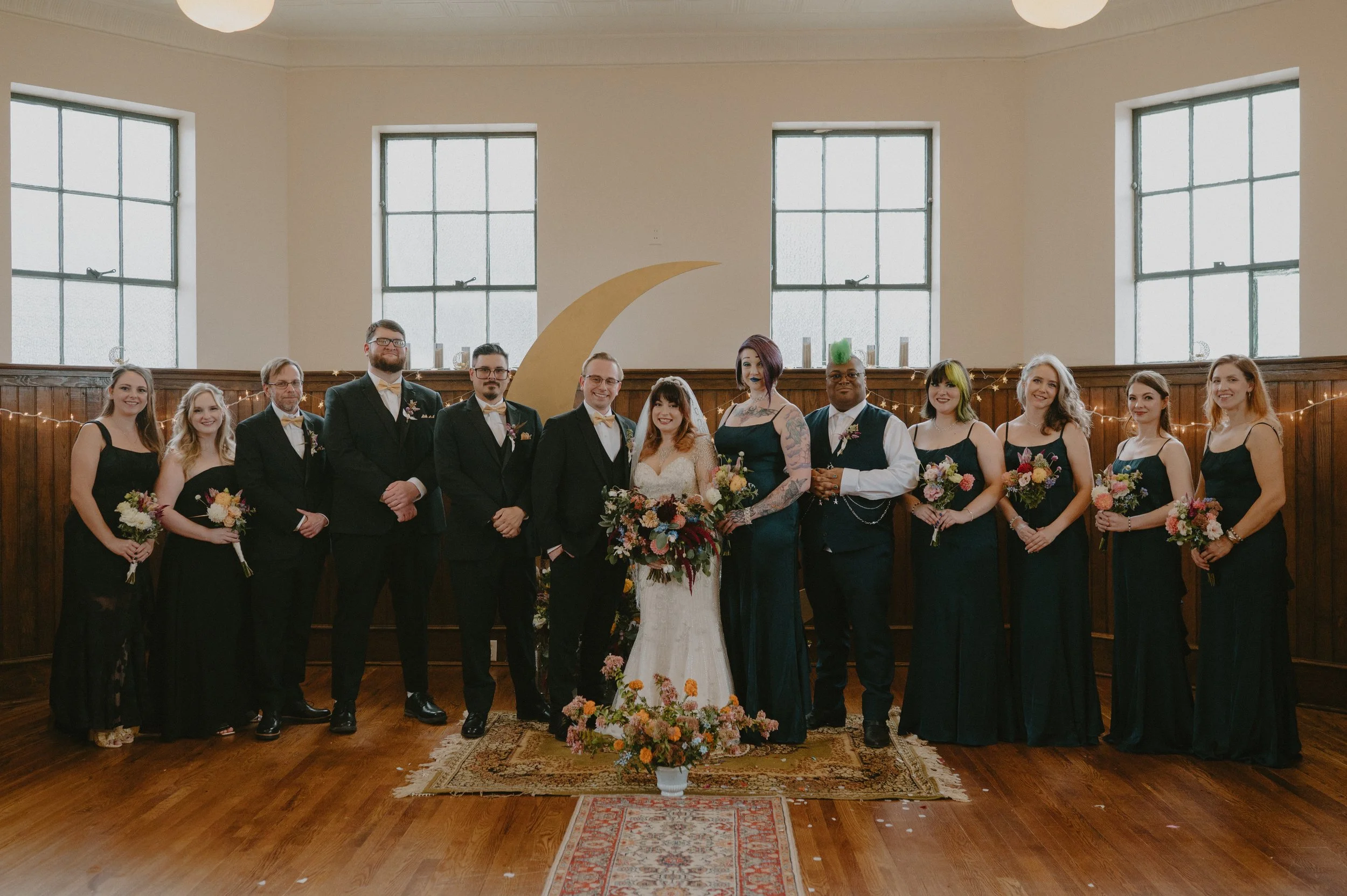 An intimate Fall wedding at Cryptid Coffee in Pelzer, SC. Anna & Robbie’s wedding flowers featured a playful and ethereal mix of colors and textures to match their eclectic taste and unique venue. Their flowers included a seasonal mix of dahlias, zinnias, delphinium, celosia, textural grasses, and light, sage colored greenery.